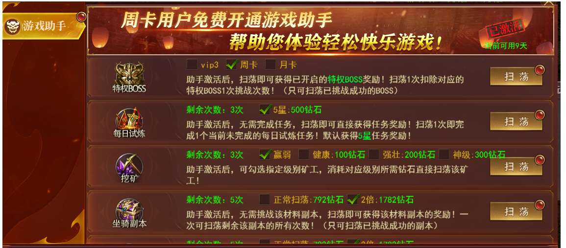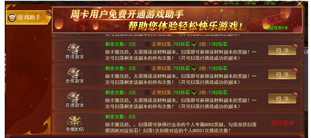 2、专属BOSS:增加快速扫荡,可扫荡击杀过的BOSS。