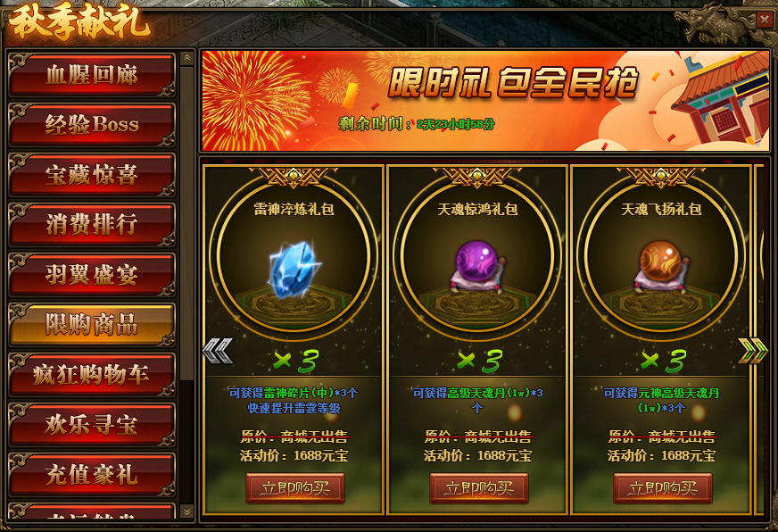 1.活动期间,玩家可在活动面板购买限购商品;(可翻页)
