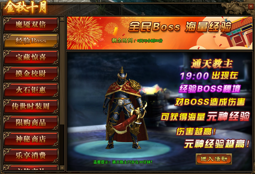 2.活动中,玩家对BOSS造成的伤害,将在活动结束后转换成元神经验并发放;