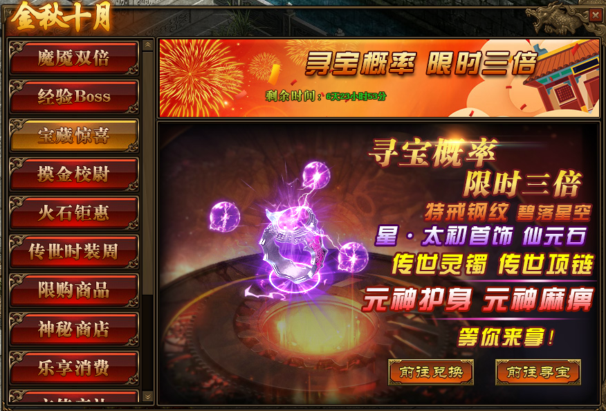 1.活动期间,玩家寻宝概率翻倍,极高几率获得星·太初首饰,特戒钢纹、仙元石、碧落星空,传世灵器、传世灵甲,传世灵器·手镯碎片、传世灵器·项链碎片,元神麻痹特戒以及元神护身特戒