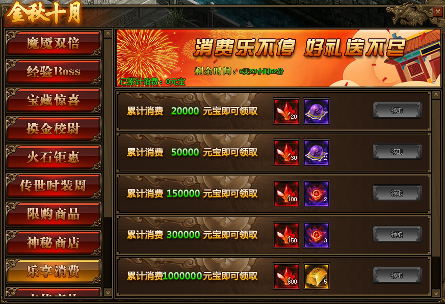 1.活动期间,玩家累计消费满足要求,可以领取境界修为、本职业星石、传世灵戒等相应奖励;