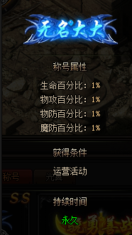定制称号:活动期间,玩家充值累计达到20000RMB,可以自己选四个字作为称号(四个汉字),全属性增加1%。