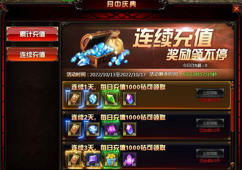 活动内容:玩家在活动时间内,累计充值达到一定钻石即可获得丰厚礼品,超值奖励等你来拿!