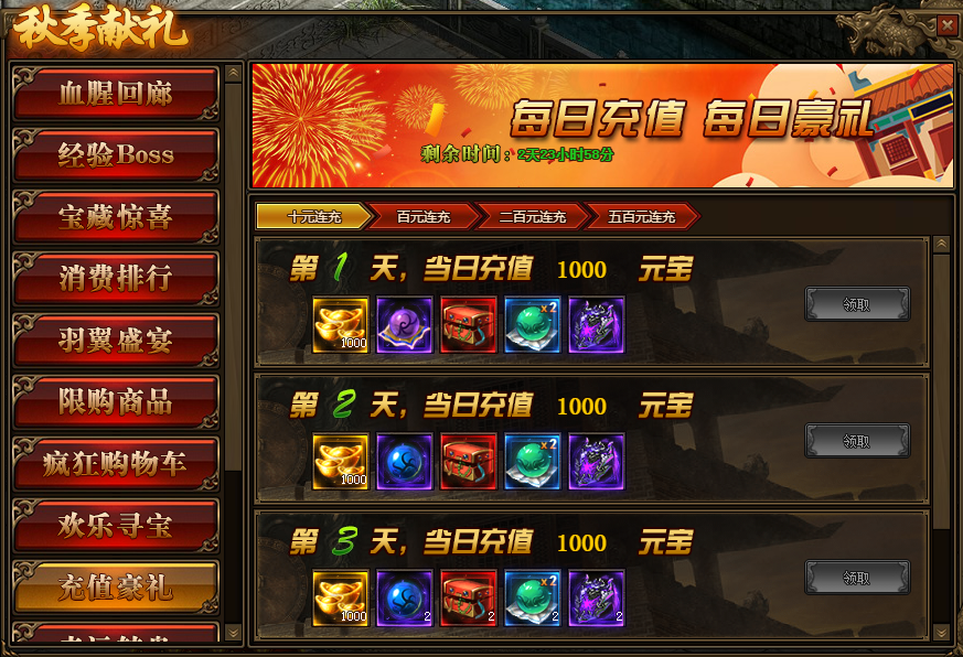 2.连续充值达到3天,奖励翻倍领,更可领取暗影晶石、地狱晶石、随机7级阵法宝珠、雷霆装备等贵重物品