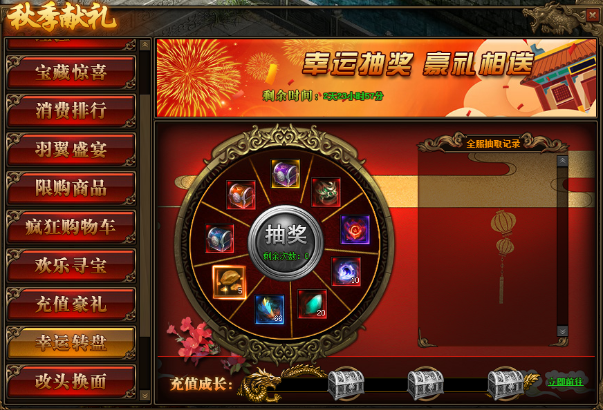 1.活动期间内,每日充值可增加充值成长值,达到一定充值成长值后可领取抽奖次数,每日最多获得3次抽奖机会;