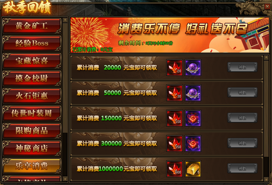 1.活动期间,玩家累计消费满足要求,可以领取境界修为、本职业星石、传世灵戒等相应奖励;