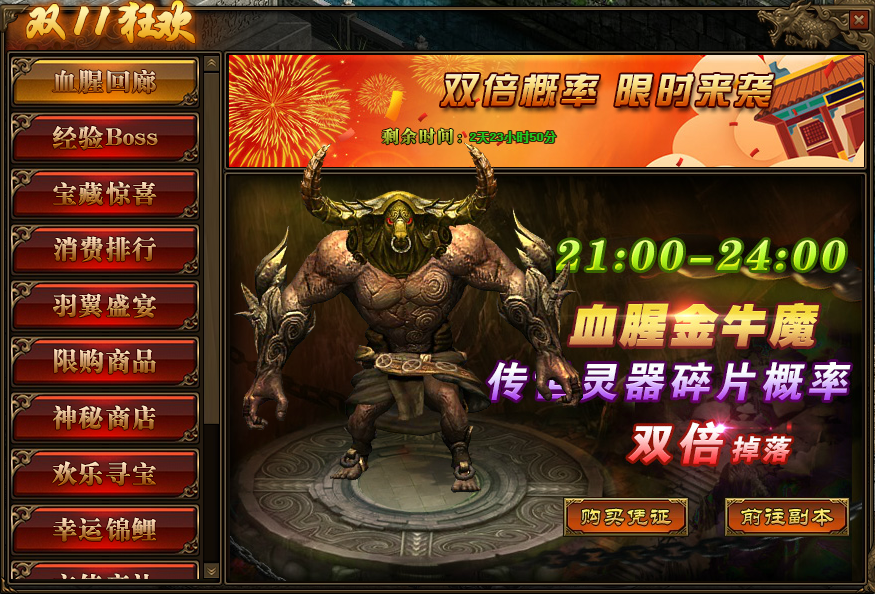 1.活动期间,玩家参与“多人副本-血腥回廊”,获得“传世灵器碎片”的概率翻倍;