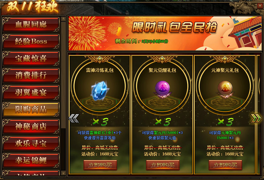 1.活动期间,玩家可在活动面板购买限购商品;(可翻页)