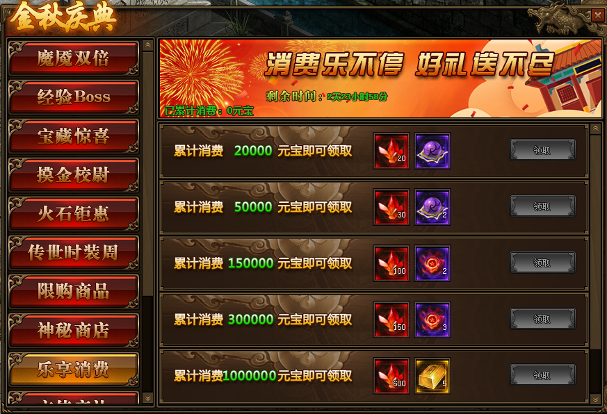 1.活动期间,玩家累计消费满足要求,可以领取境界修为、本职业星石、传世灵戒等相应奖励;