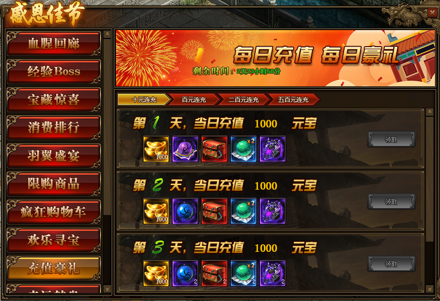 2.连续充值达到3天,奖励翻倍领,更可领取暗影晶石、地狱晶石、随机7级阵法宝珠、雷霆装备等贵重物品