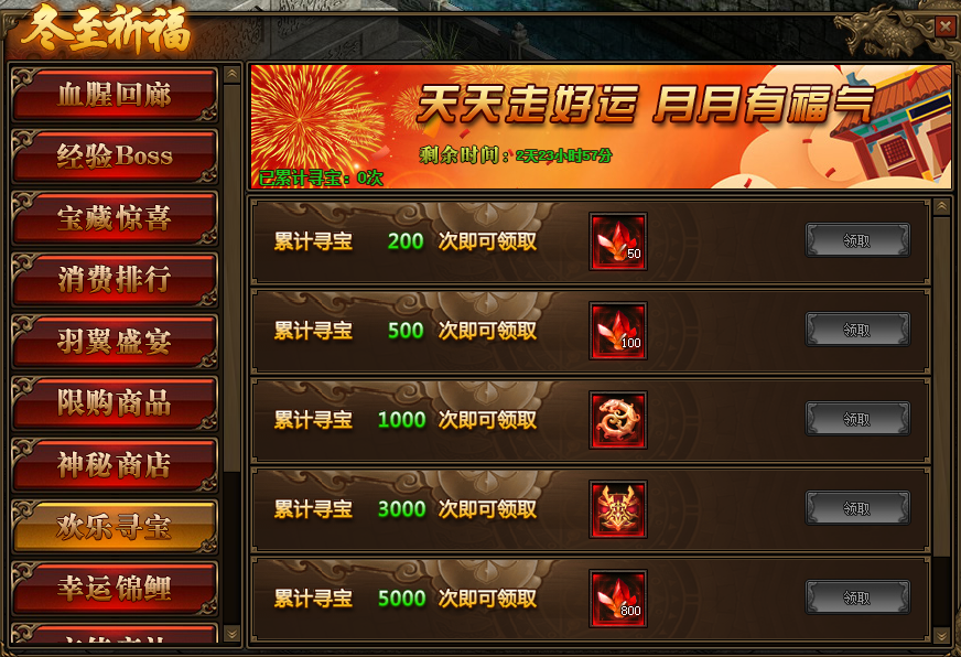 1.活动期间,玩家累积寻宝次数满足要求,可以领取本职业星石、本职业仙装、传世仙装等相应奖励;