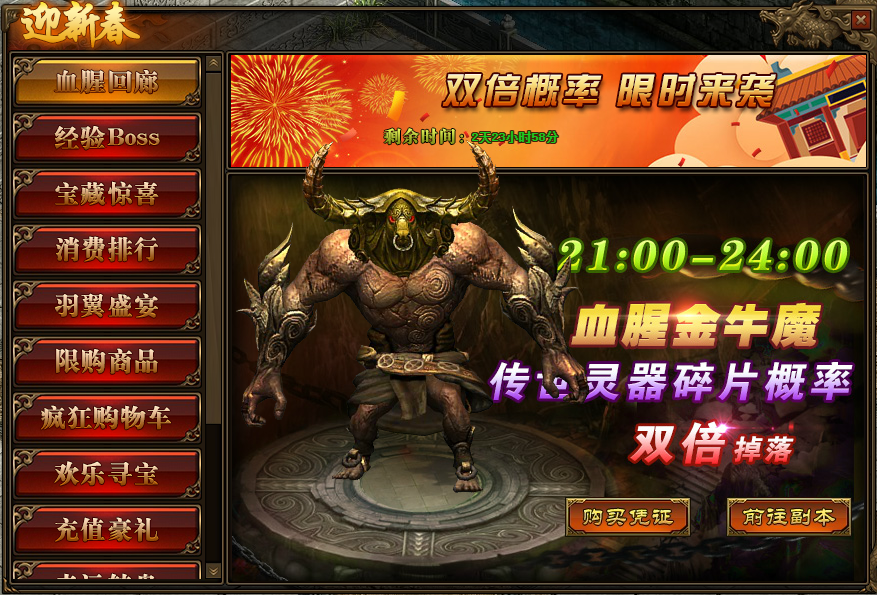 1.活动期间,玩家参与“多人副本-血腥回廊”,获得“传世灵器碎片”的概率翻倍;