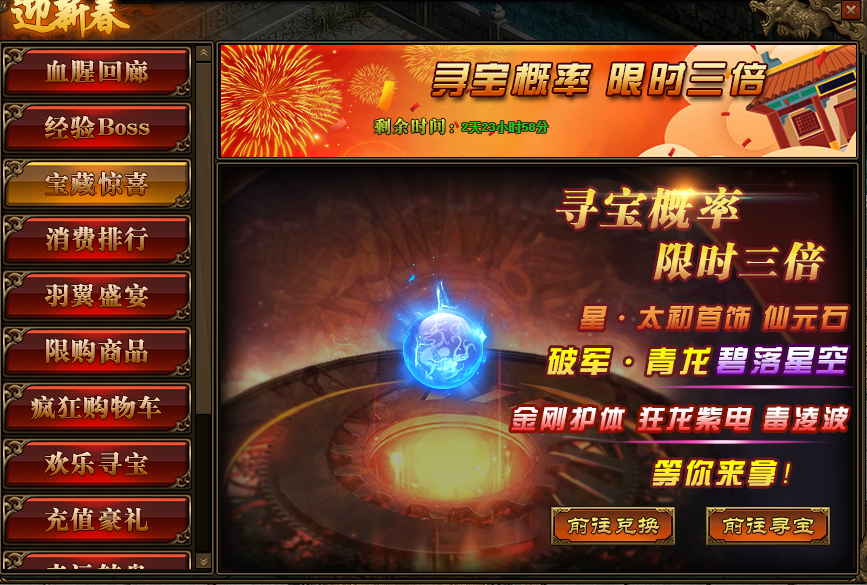 1.活动期间,玩家寻宝概率翻倍,极高几率获得星·太初首饰,特戒钢纹、仙元石、碧落星空,传世灵器、传世灵甲,封神秘法书页以及破军·青龙