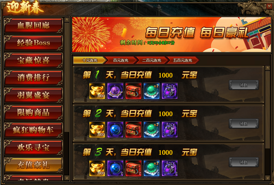 2.连续充值达到3天,奖励翻倍领,更可领取暗影晶石、地狱晶石、随机7级阵法宝珠、雷霆装备等贵重物品