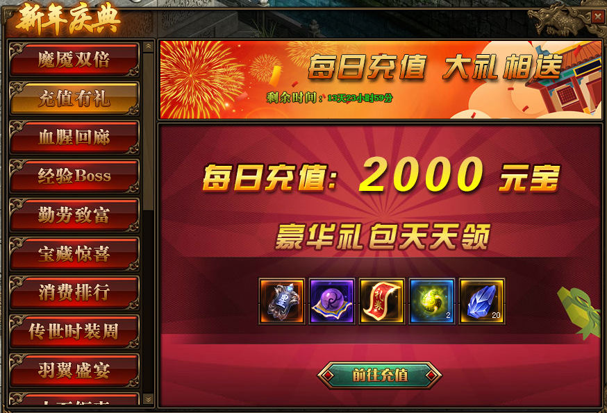 1.活动期间,每天充值2000元宝可领取豪华礼包;