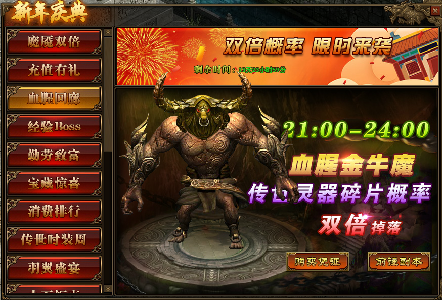1.活动期间,玩家参与“多人副本-血腥回廊”,获得“传世灵器碎片”的概率翻倍;