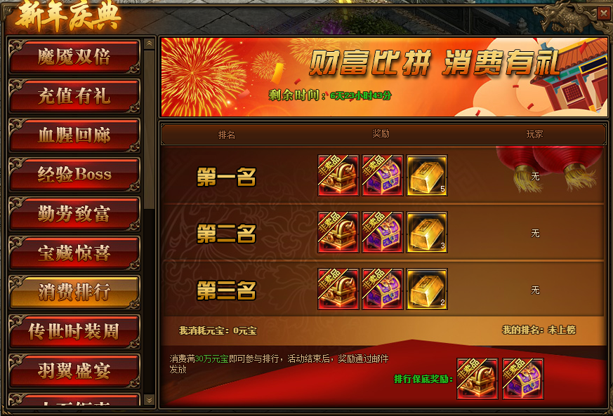 1.活动期间,玩家消费满30万元宝参与排行