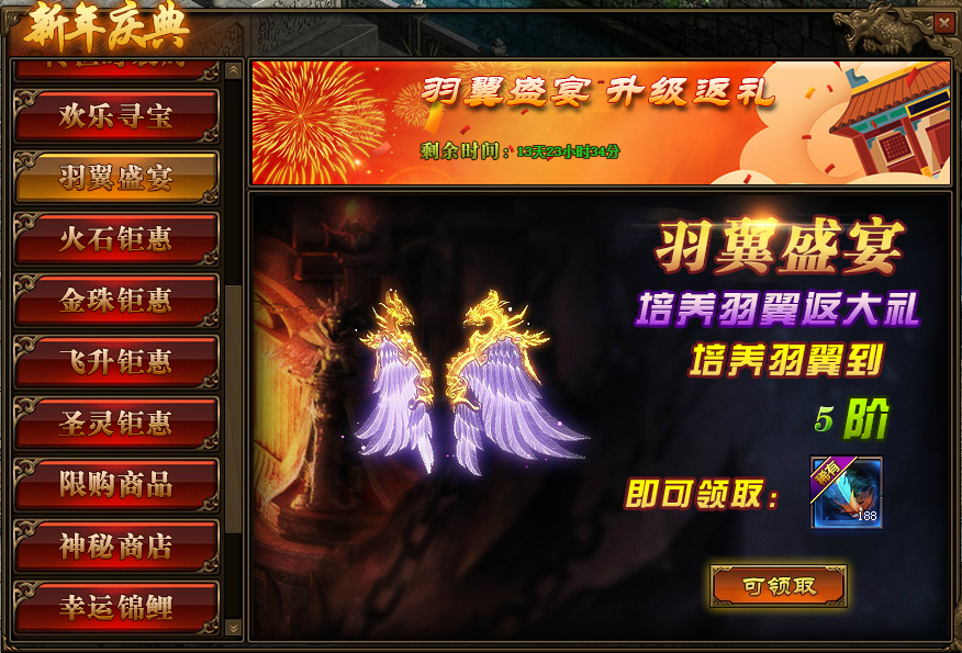 1.活动期间,玩家羽翼只需达到5级,即可领取一定数量的羽毛;