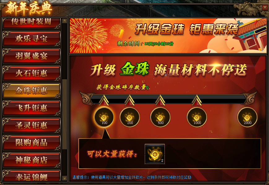 活动期间,玩家获得火石碎片数量,达到条件可领取对应金珠碎片奖励。