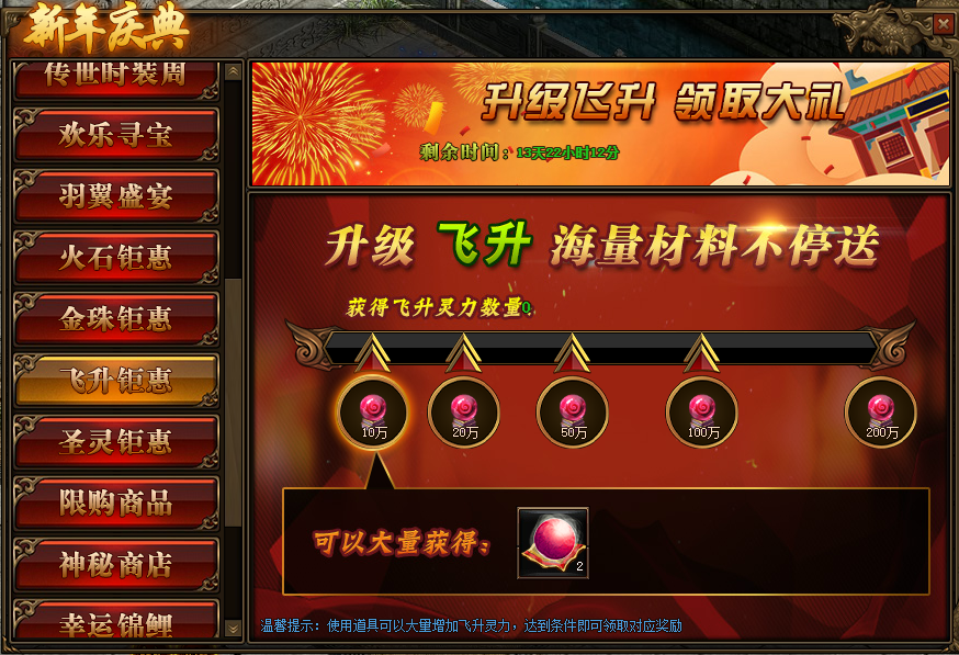 活动期间,玩家获得火石碎片数量,达到条件可领取对应飞升灵力奖励。