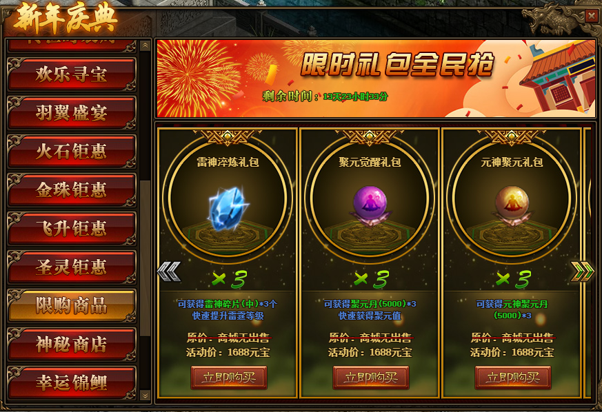 1.活动期间,玩家可在活动面板购买限购商品;(可翻页)