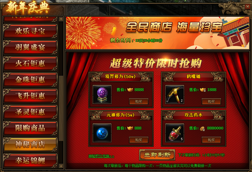 2.神秘商店每2小时自动刷新一次,也可用花费元宝立即刷新;