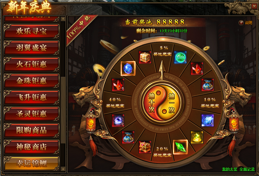 1.活动开启后奖池内默认存入88888元宝,每抽奖1次可使奖池内增加100元宝