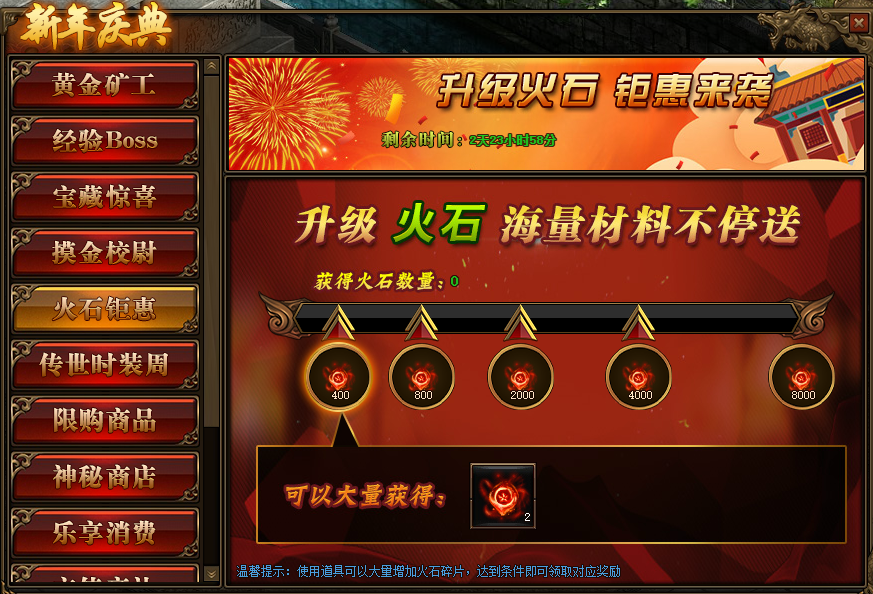 1.活动期间,玩家获得火石碎片数量,达到条件可领取对应火石碎片奖励。