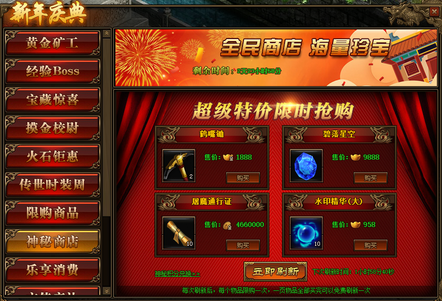 2.神秘商店每2小时自动刷新一次,也可用花费元宝立即刷新;