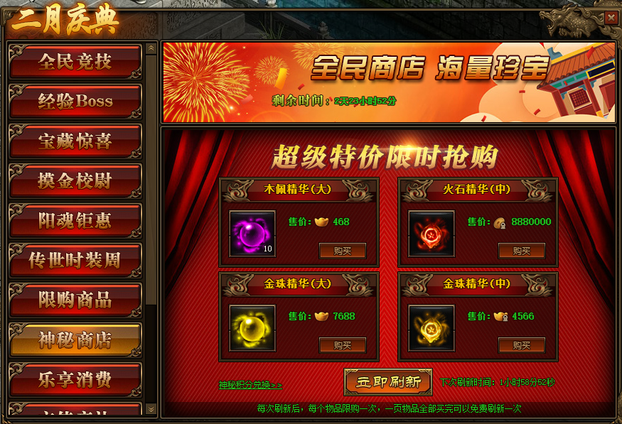 2.神秘商店每2小时自动刷新一次,也可用花费元宝立即刷新;