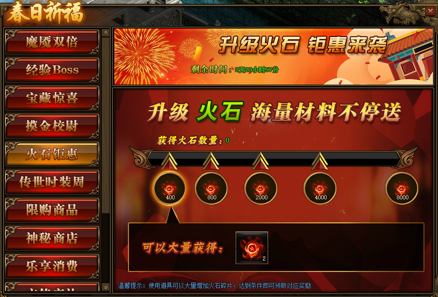 1.活动期间,玩家获得火石碎片数量,达到条件可领取对应火石碎片奖励。
