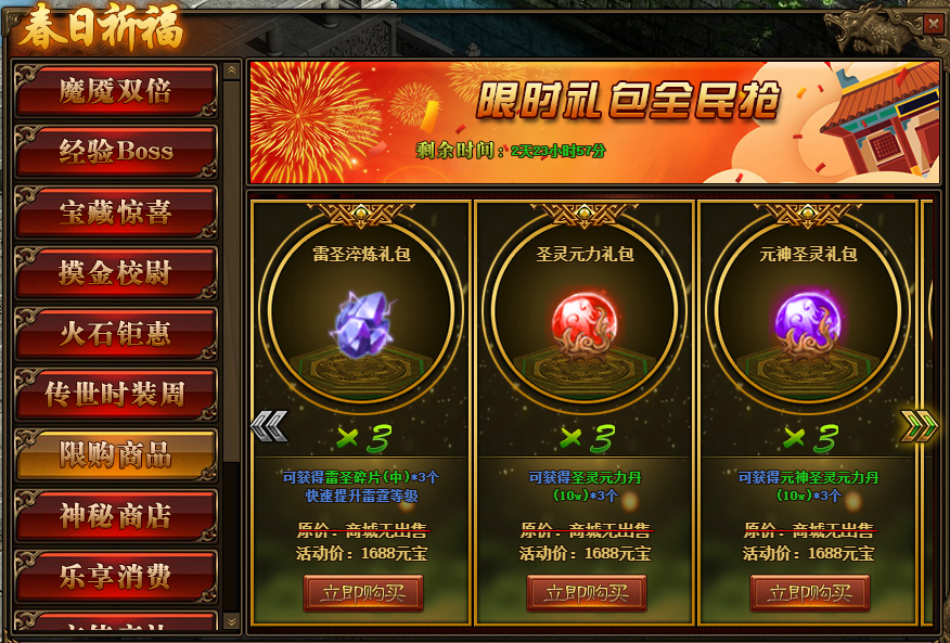 1.活动期间,玩家可在活动面板购买限购商品;(可翻页)