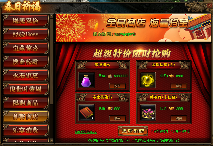 2.神秘商店每2小时自动刷新一次,也可用花费元宝立即刷新;