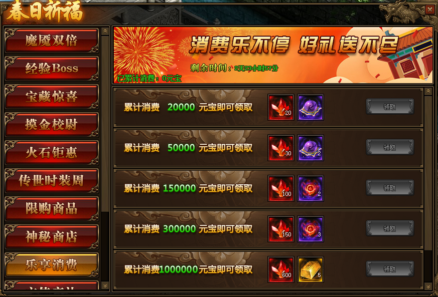 1.活动期间,玩家累计消费满足要求,可以领取境界修为、本职业星石、传世灵戒等相应奖励;