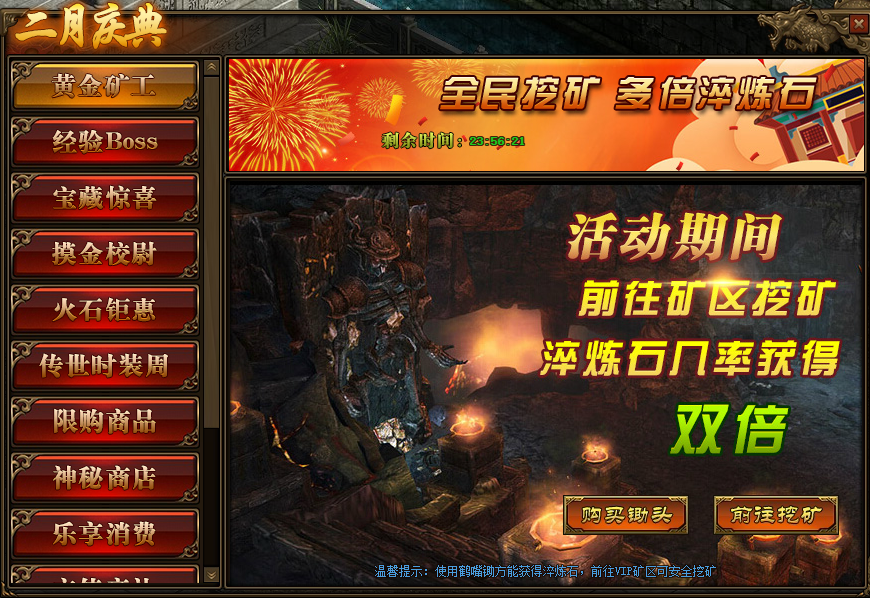 2.注意:必须使用“鹤嘴锄”才可获得“淬炼石”,在VIP矿区可安全挖矿;