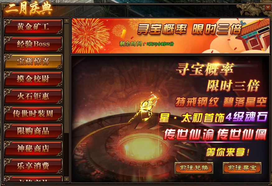 1.活动期间,玩家寻宝概率翻倍,极高几率获得星·太初首饰,传世灵器、传世灵甲,特戒钢纹,仙元石、碧落星空,传世灵器、传世灵甲,高级天魂石、四级魂石,传世灵器·仙谕以及传世灵器·仙佩