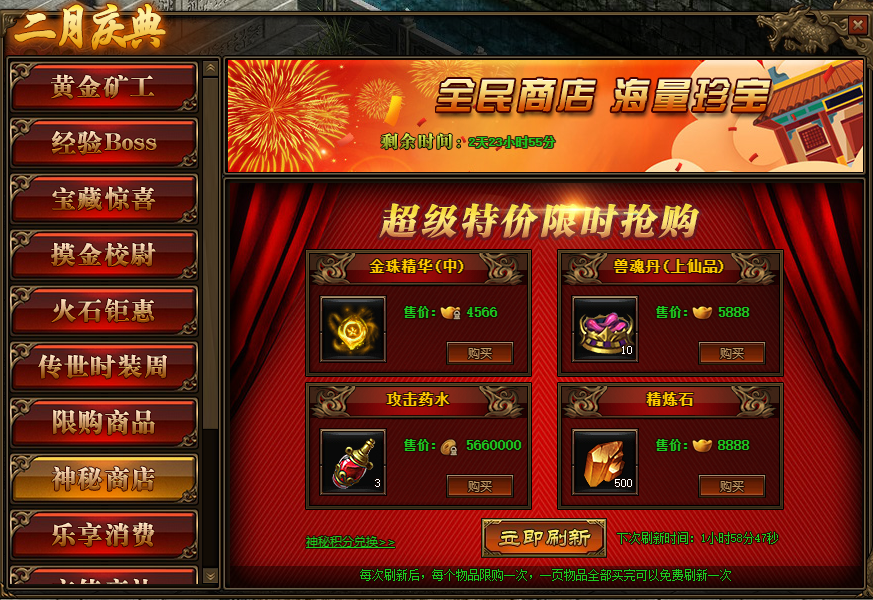 2.神秘商店每2小时自动刷新一次,也可用花费元宝立即刷新;