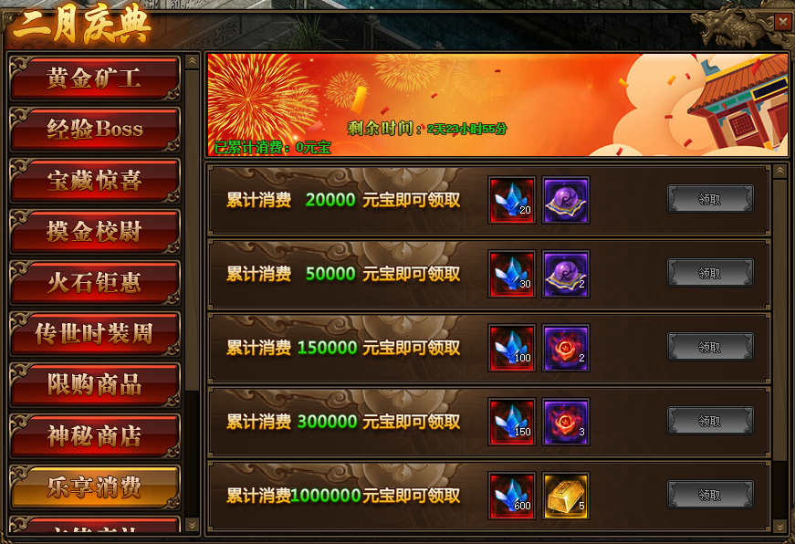 1.活动期间,玩家累计消费满足要求,可以领取境界修为、本职业星石、传世灵戒等相应奖励;
