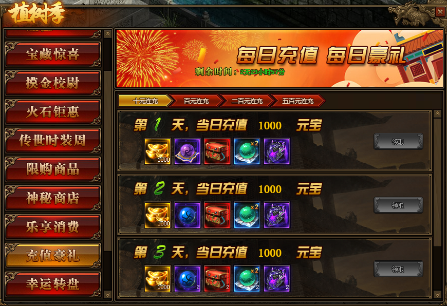 2.连续充值达到3天,奖励翻倍领,更可领取暗影晶石、地狱晶石、随机阵法宝珠宝箱等贵重物品