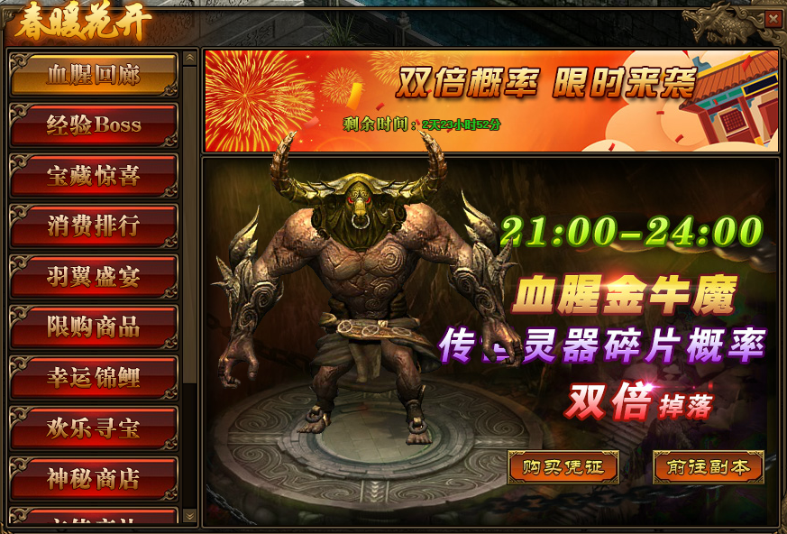 1.活动期间,玩家参与“多人副本-血腥回廊”,获得“传世灵器碎片”的概率翻倍;