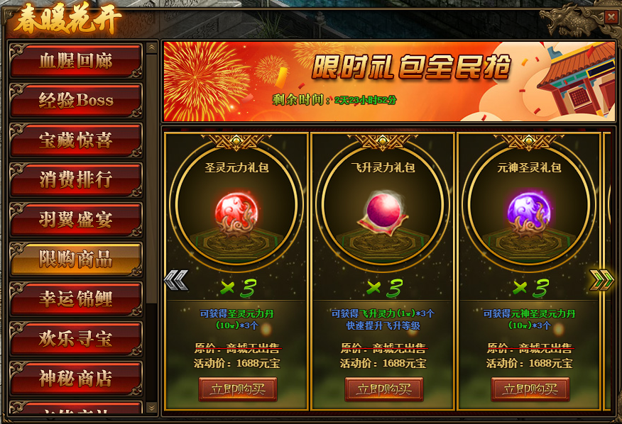 1.活动期间,玩家可在活动面板购买限购商品;(可翻页)