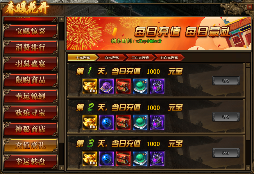 2.连续充值达到3天,奖励翻倍领,更可领取暗影晶石、地狱晶石、随机7级阵法宝珠、8级阵法宝珠等贵重物品