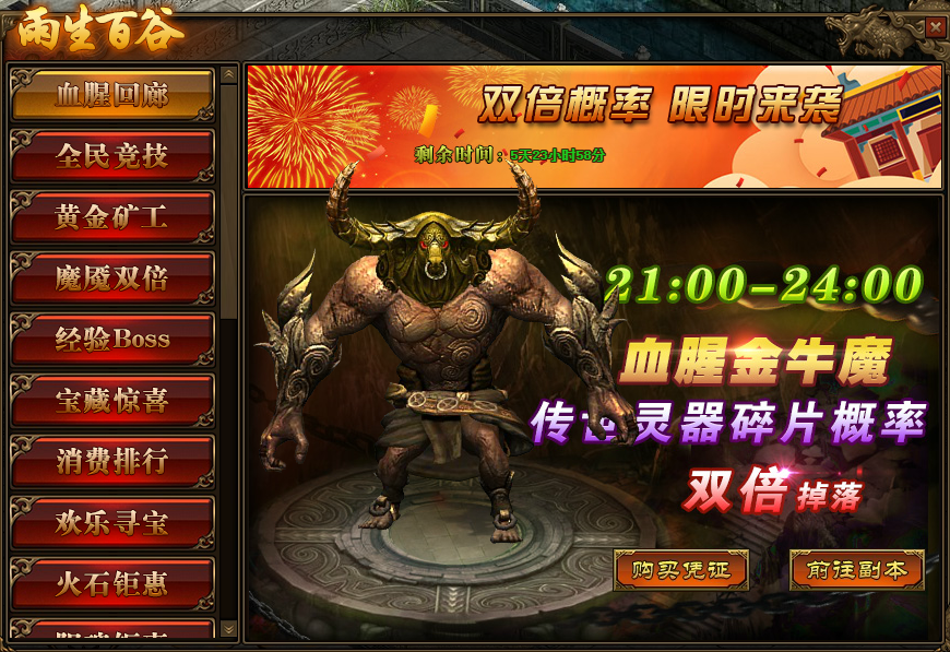 1.活动期间,玩家参与“多人副本-血腥回廊”,获得“传世灵器碎片”的概率翻倍;