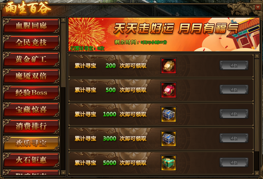 1.活动期间,玩家累积寻宝次数满足要求,可以领取本职业星石、本职业仙装、传世仙装等相应奖励;