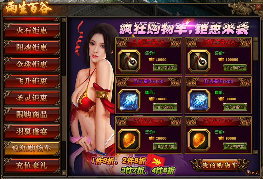 1.活动期间,玩家可在将碧落星空、龙纹福袋等物品放入我的购物车;