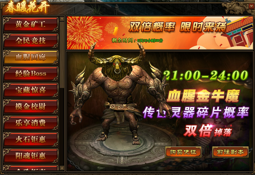 1.活动期间,玩家参与“多人副本-血腥回廊”,获得“传世灵器碎片”的概率翻倍;