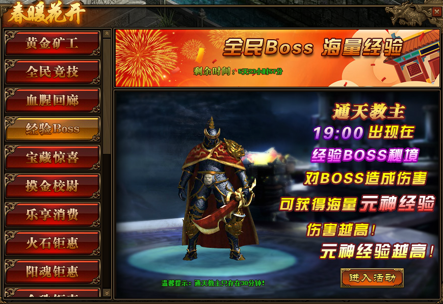 2.活动中,玩家对BOSS造成的伤害,将在活动结束后转换成元神经验并发放;