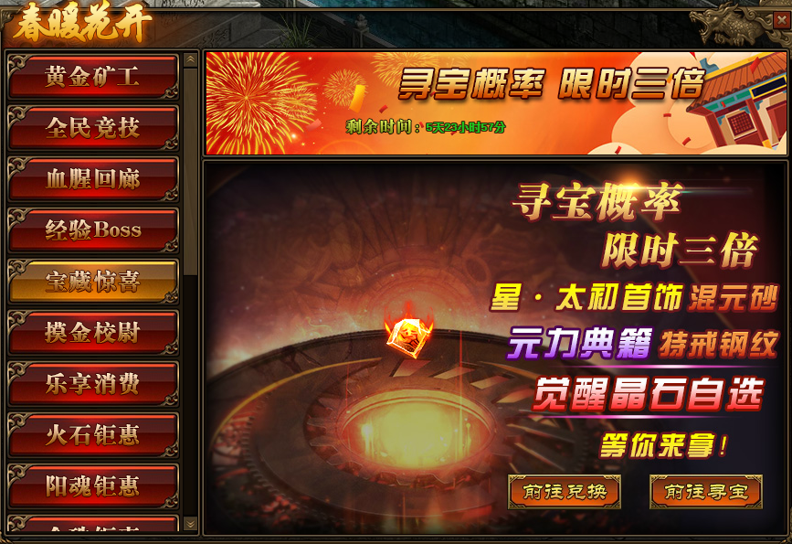 1.活动期间,玩家寻宝概率翻倍,极高几率获得星·太初首饰,特戒钢纹、仙元石、碧落星空,传世灵器、传世灵甲,传世灵器·手镯碎片、传世灵器·项链碎片,元神麻痹特戒以及元神护身特戒