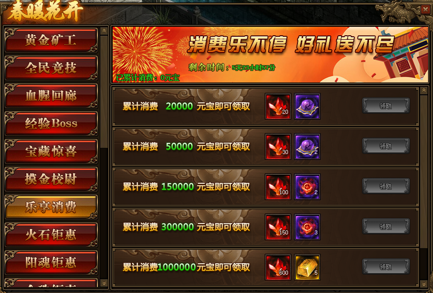1.活动期间,玩家累计消费满足要求,可以领取境界修为、本职业星石、传世灵戒等相应奖励;