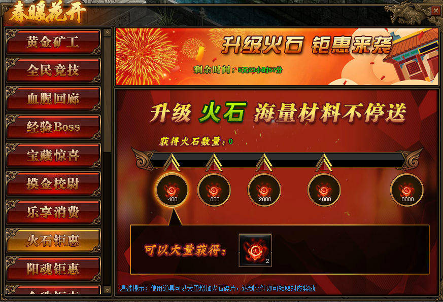 1.活动期间,玩家获得火石碎片数量,达到条件可领取对应火石碎片奖励。